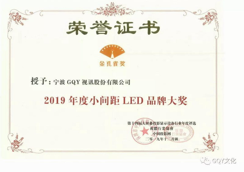 2019視聽行業(yè)高峰論壇暨金孔雀頒獎(jiǎng)盛典于12月20日在深圳圣廷苑酒店隆重舉行。作為視聽行業(yè)最具權(quán)威性的行業(yè)論壇以及頒獎(jiǎng)盛典,在現(xiàn)場六百余名與會(huì)者的共同見證下,GQY榮獲了視聽行業(yè)協(xié)會(huì)與中國投影網(wǎng)共同頒發(fā)的3項(xiàng)金孔雀大獎(jiǎng),分別是“2019年度小間距LED品牌大獎(jiǎng)”、“2019年度大屏拼接品牌大獎(jiǎng)”、“2019年度LED藝術(shù)創(chuàng)新獎(jiǎng)”。
