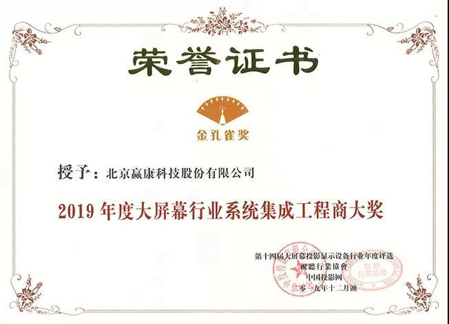 12月20日,2019視聽行業(yè)高峰論壇暨金孔雀頒獎在深圳隆重舉行,該論壇是視聽行業(yè)權(quán)威性的行業(yè)論壇。贏康憑借著2019年出色的項目工程工作,在頒獎典禮上獲得了2019年度大屏幕行業(yè)系統(tǒng)集成工程商大獎與2019年度優(yōu)秀案例大獎。
