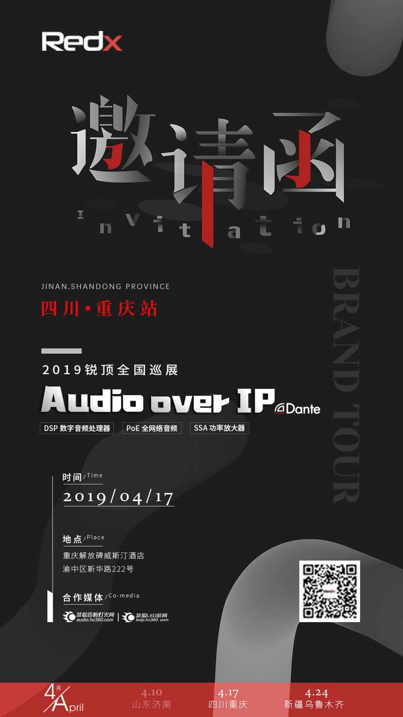 在這美好的4月,“Audio over IP——2019 Redx全國巡展“10日在山東濟南喜來登酒店開啟。Redx秉承“Audio over IP “理念,致力于為用戶提供全網(wǎng)絡化音頻解決方案。展出的產(chǎn)品均采用了Dante音頻傳輸協(xié)議,包括:Dante話筒、數(shù)字音頻處理器、PoE音箱以及PoE線陣列等,此外我們的系統(tǒng)從音頻輸入、處理到音箱還原也都采用網(wǎng)線連接。