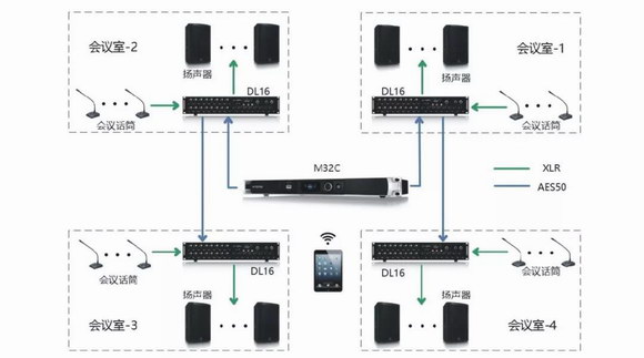 M32C具有雙AES50網(wǎng)絡(luò)接口,最大可擴(kuò)展到96個輸入和96個輸出。根據(jù)會議室音頻信號的傳輸通道需求,可將DL16/DL32分別配接在兩個不同的會議室,僅通過兩根cat5類網(wǎng)線便能實現(xiàn)兩個會議室的集中控制。通過ipad等應(yīng)用軟件進(jìn)行混音和信號分配,并且M32C允許多臺應(yīng)用設(shè)備接入控制,可用兩個ipad分別控制兩個會議室。M32C前面板配備A類USB插口用于音頻和數(shù)據(jù)傳輸,可實現(xiàn)會議錄音功能,導(dǎo)出導(dǎo)入wav音頻格式文件。