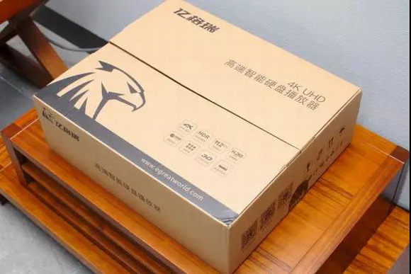 第一眼看到億格瑞A13的包裝,給我的印象就是很大而且很有份量感,作為一個曾經(jīng)的硬盤播放器玩家來說,這個規(guī)格尺寸和重量很對得起旗艦這個名稱,左下角是Egreat的圖騰一只犀利的雄鷹頭像,而右下角上印制著億格瑞A13的八大特色功能,它們分別是4K 60Hz輸出、HDR高動態(tài)圖像、11.2CH源碼輸出、H.265高清解碼、原盤導(dǎo)航、智能海報(bào)墻、3D格式支持以及硬盤抽取盒。