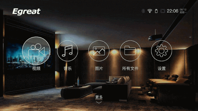 桌面以私人影院為背景,傳達(dá)出億格瑞A13專為電影而生的旗艦影音產(chǎn)品,簡潔明快的系統(tǒng)界面和選項(xiàng)布局合理的應(yīng)用圖標(biāo),以簡潔且辨識度極高的圓形圖標(biāo)方式呈現(xiàn)給用戶,只需點(diǎn)選相關(guān)功能即可直達(dá)所需內(nèi)容界面。