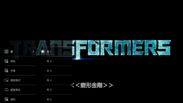 在影片播放當(dāng)中,點(diǎn)選遙控器上的菜單鍵,即可呼出左側(cè)菜單列表,用戶可以進(jìn)行章、音軌、字幕、播放模式等設(shè)置中,按自已的觀影需求選擇合適的設(shè)置。