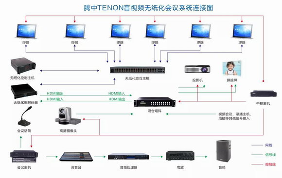 根據(jù)用戶的使用需求,本次會議室設計一套無紙化會議系統(tǒng),根據(jù)會議室的布局,在會議室每個座位設計一臺液晶升降一體機,安裝無紙化軟件;同時設計一臺無紙化控制主機,作為系統(tǒng)的管理和控制中心,無紙化平板電腦通過無線網(wǎng)絡與無紙化控制主機連接,組成一套完整的智能交互式無紙化會議系統(tǒng)。