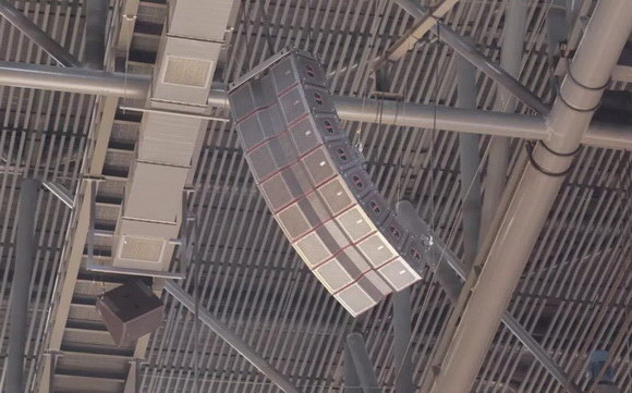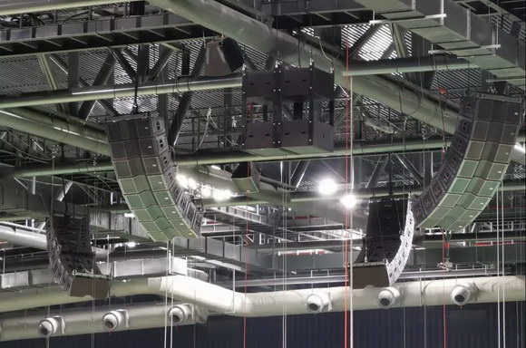 場館內(nèi)的音箱采用分區(qū)擴聲方式設(shè)計,六組進口B&C定制單元組成的雙12寸線陣列音箱針對觀眾席進行分區(qū)擴聲,6只同軸音箱TS66針對場地內(nèi)擴聲。TS-SUB超低頻組合陣列指向設(shè)計,可控制低頻發(fā)散指向方式,讓低頻波束上部衰減下部疊加,減輕體育館上空的低頻共振現(xiàn)象。