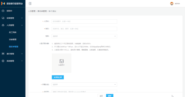 支持黑名單單個(gè)添加、編輯和導(dǎo)出操作;支持管理方預(yù)先在后臺(tái)上傳被列入黑名單的人員的照片,以及更豐富的個(gè)人信息,包括姓名、性別、年齡、手機(jī)號(hào)、身份證號(hào)碼、IC卡號(hào)、民族、籍貫、聯(lián)系地址、出生日期等。