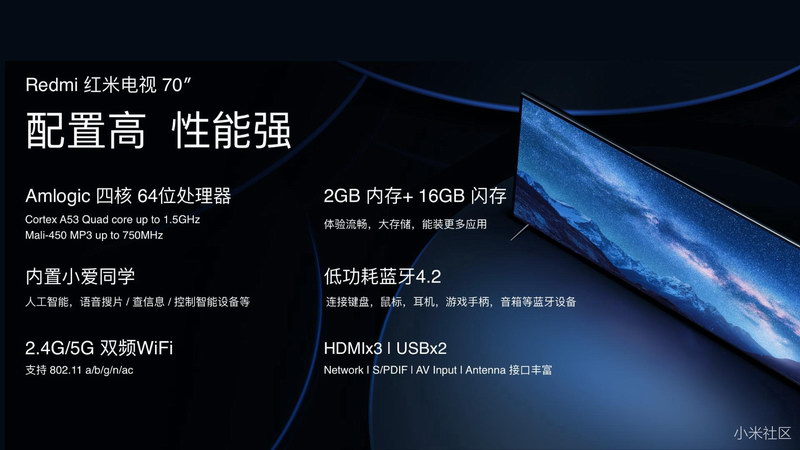 Redmi紅米電視采用Amlogic 四核 64位高性能處理器,2GB+16GB大儲(chǔ)存,體驗(yàn)更流暢;2.4G/5G 雙頻WiFi聯(lián)網(wǎng)不卡頓;應(yīng)用低功耗藍(lán)牙4.2連接藍(lán)牙設(shè)備更穩(wěn)定!豐富接口,滿(mǎn)足多種娛樂(lè)需求,輕松連接電腦、連接游戲主機(jī)、連接外接音響設(shè)備。