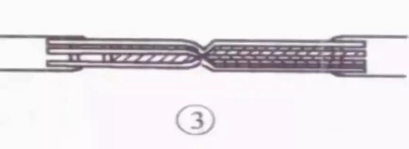 將兩根雙芯線線頭剖削成圖示中的形式。連接時(shí),將兩根待連接的線頭中顏色一致的芯線按小截面直線連接方式連接。用相同的方法將另一顏色的芯線連接在一起。