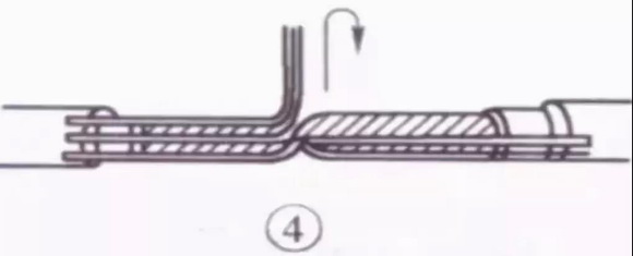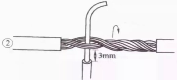 接著把這兩股芯線按順時(shí)針方向緊纏2圈后,再折回90° 并平臥在折起前的軸線位置上。