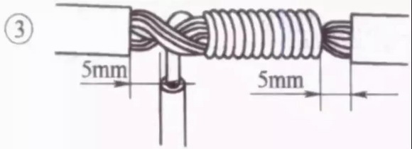 把3根線芯的一組在干線右邊按順時(shí)針方向緊緊纏繞3~4圈,并鉗平線端;把4根芯線的一組在干線的左邊按逆時(shí)針方向纏繞4~5圈。