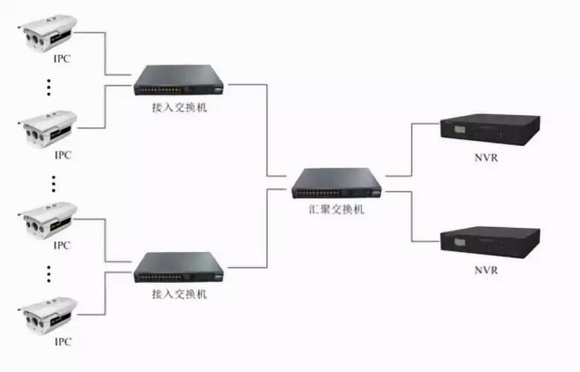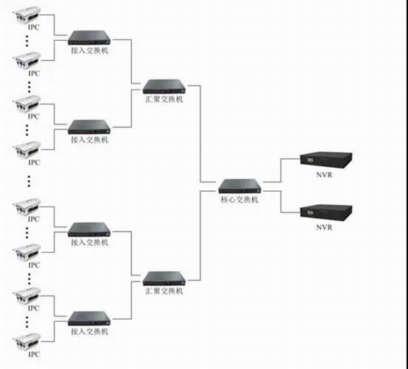如采用200萬像素IPC,碼流以4Mbps計(jì)算,20臺(tái)攝像機(jī)占用帶寬為4M*20=80M,如果是按照10臺(tái)攝像機(jī)接入百兆交換機(jī)的話,那么我們需要2臺(tái)接入層交換機(jī),那么匯聚層交換機(jī)需要二層千兆交換機(jī)。
