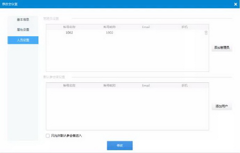 3.點(diǎn)擊會(huì)議室信息的【人員設(shè)置】,可以添加此會(huì)議室的永久管理員。
