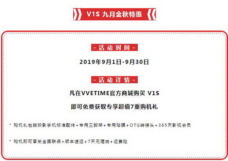 中國視聽網(wǎng)(www.fjypw.com) > 行業(yè)資訊 > 視聽活動(微型投影) > 7重購機(jī)禮包免費送!9月V1S專享獨寵你!