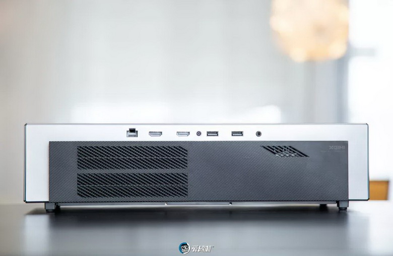 機(jī)身后面有散熱口,以及各種接口,從左往右分別是:網(wǎng)線(xiàn)接口,兩個(gè) HDMI 接口,HDMI 1 支持 ARC,兩個(gè) USB 接口,一個(gè) 3.5mm 音頻接口。