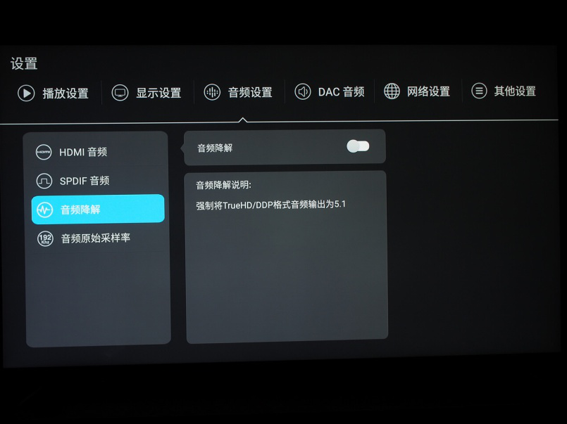 音頻設(shè)置上,如果你接的功放支持全景聲輸出那么建議選擇源碼輸出,如果是接回音壁這類只能解碼AC3或者DTS的設(shè)備則需要將降解功能打開。