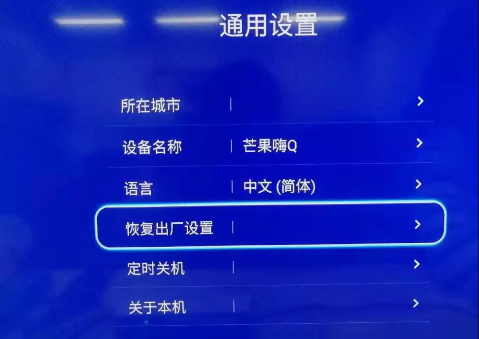 如果以上情況都不行,那就得恢復(fù)出廠設(shè)置。電視恢復(fù)出廠設(shè)置以后原來做的設(shè)置和下載的應(yīng)用都會全部消失,什么都沒有了,電視盒肯定也就沒有負(fù)擔(dān)了,不過呢,一般不建議恢復(fù)出廠設(shè)置,畢竟原來很多設(shè)置好的再次重新去弄也比較麻煩。(選擇“系統(tǒng)設(shè)置”—“通用設(shè)置”—“關(guān)于本機(jī)”即可)