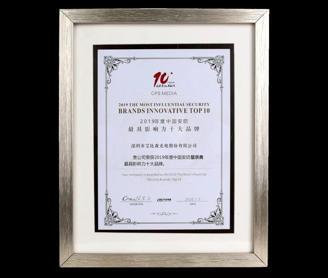 艾比森憑借安防領(lǐng)域的綜合實(shí)力及品牌影響力榮獲“2019年度中國(guó)安防顯示類(lèi)最具影響力十大品牌”。