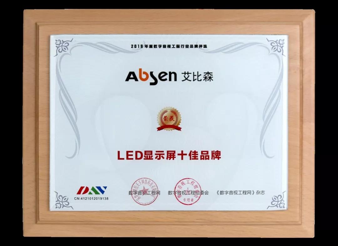 在2019年第十屆數(shù)字標(biāo)牌行業(yè)金孔雀頒獎(jiǎng)典禮上,艾比森獲得了“優(yōu)秀LED顯示屏品牌大獎(jiǎng)”。