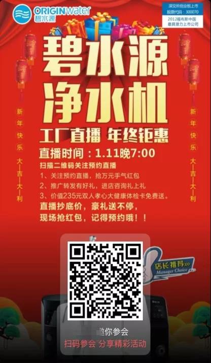 這一次,碧水源與微吼合作,將直播間搬到產(chǎn)品體驗區(qū)。客戶進入直播間,開屏海報映入眼簾,碧水源公眾號二維碼隨即彈出,歡迎模式不僅充滿人性化還進一步擴充自身私域流量池。
