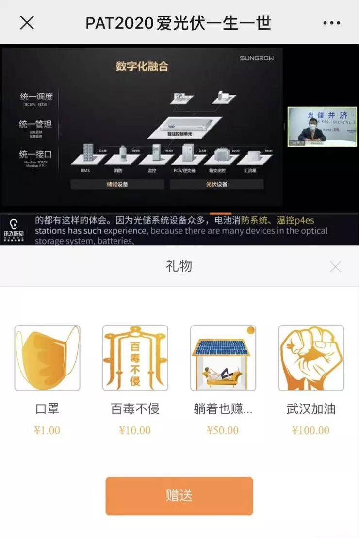 直播中,合肥主會場用VMIX推流,抓取嘉賓畫面推流,實現(xiàn)多地嘉賓互動。而訊飛聽見更是現(xiàn)場連接了合肥總控調(diào)音臺,將接收音頻同傳翻譯,利用VMIX將字幕合成到直播觀看界面,供海內(nèi)外觀眾詳細了解會議內(nèi)容。疫情當下,陽光電源通過微吼產(chǎn)品后臺將自定義禮物設(shè)計為貼近現(xiàn)實的口罩與百毒不侵符,拉近了與觀眾的距離。