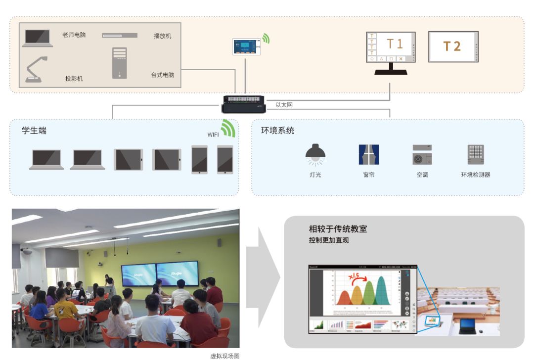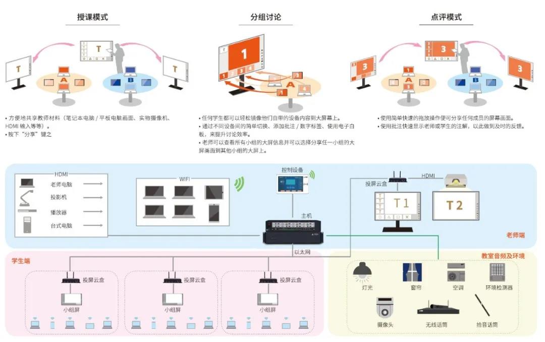 老師可以輕松地在課堂上調(diào)用多種資源,使用智能手機(jī)或平板電腦界面直觀地切換內(nèi)容。放映資源可以是任何內(nèi)容,從傳統(tǒng)標(biāo)準(zhǔn)音視頻設(shè)備到每一位學(xué)生攜帶的個(gè)人設(shè)備的畫(huà)面。