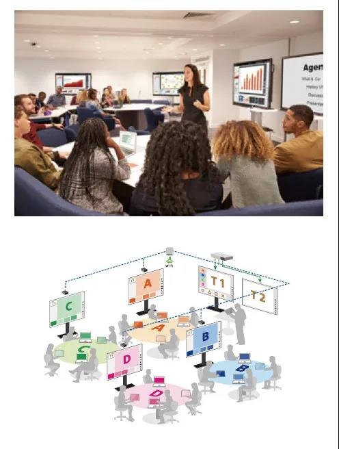 這一教室模式的最大特點(diǎn)是可以任意組織課堂形態(tài)、方便信息共享,組團(tuán)之間、學(xué)生之間、師生之間的屏幕均可以任意切換,可以交互點(diǎn)評(píng),有效提高教學(xué)效率。