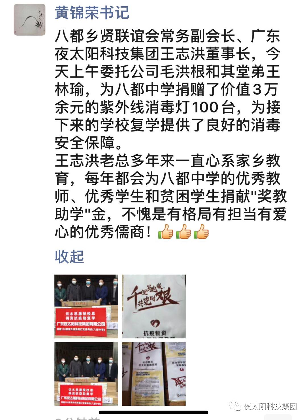 當(dāng)前企業(yè)復(fù)工復(fù)產(chǎn)、學(xué)校順利開學(xué)助社會經(jīng)濟(jì)有序恢復(fù)迫在眉睫。學(xué)校人員密集,防疫工作至關(guān)重要,夜太陽集團(tuán)董事長王志洪了解到學(xué)校防疫物資緊缺,立刻向母校八都中學(xué)校領(lǐng)導(dǎo)聯(lián)系,為八都中學(xué)捐贈了價值30000元的紫外線殺菌消毒燈100臺作為防疫物資,助力學(xué)校抗擊疫情,促開學(xué)與疫情防控兩不誤,解決了該校春季開學(xué)防控物資緊缺的燃眉之急。