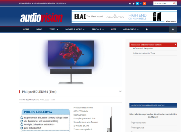 OLED984是繼OLED934之后,飛利浦與寶華韋健B&W二度聯(lián)名的力作,在追求視聽(tīng)華麗享受上,可謂精益求精。德國(guó)知名科技雜志《Audiovision》對(duì)飛利浦65OLED984進(jìn)行了測(cè)評(píng),全面驗(yàn)證其外觀設(shè)計(jì)、畫(huà)質(zhì)處理、音質(zhì)表現(xiàn)、響應(yīng)速度、操作方式等方面的實(shí)力。該測(cè)評(píng)認(rèn)為OLED984不但對(duì)色彩進(jìn)行了精細(xì)打磨,也實(shí)現(xiàn)了身臨其境的現(xiàn)場(chǎng)感音效,澎湃華麗的視聽(tīng)表現(xiàn)給人奢侈品般的感受。