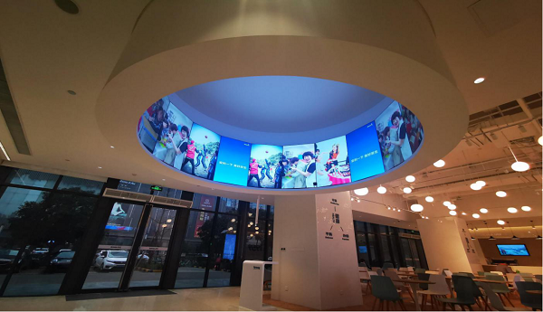 ①環(huán)形微笑屏——由16臺(tái)46寸液晶屏拼接而成的環(huán)形屏,吊裝在前廳頂部, 對安裝的穩(wěn)定性、安全性要求很高。在軟件功能上可以實(shí)現(xiàn)參觀者人臉捕捉,然后 上傳至環(huán)形屏進(jìn)行展示,今后將記錄每一位參觀顧客的微笑,增加體驗(yàn)館的人氣;