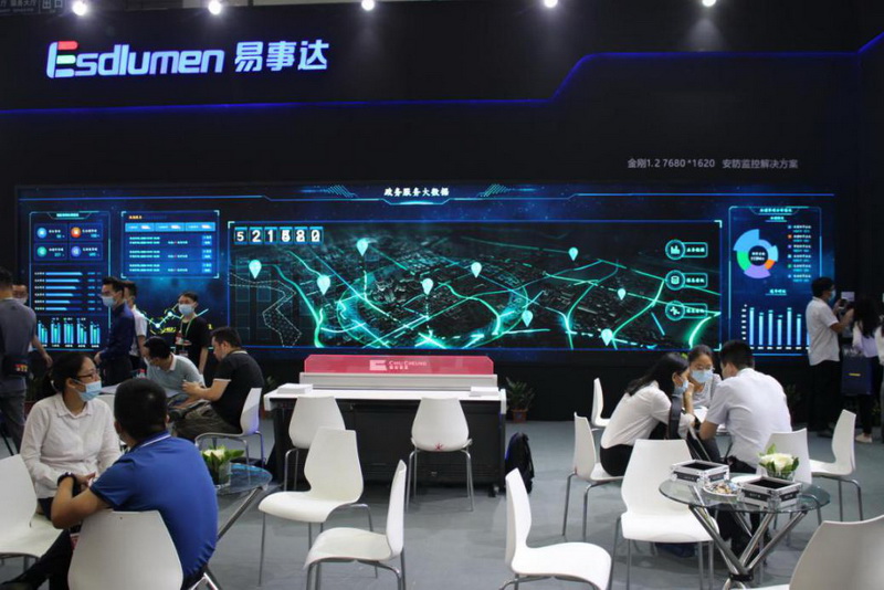安防監(jiān)控是戶內(nèi)固裝LED顯示屏的主要應(yīng)用之一,本次展會上易事達(dá)的安防監(jiān)控大屏幕是由96個易事達(dá)金剛P1.2 箱體打造而成,可實現(xiàn)無縫拼接與8K超高清顯示,讓各項數(shù)據(jù)圖形都清晰可辨,體現(xiàn)了金剛1.2在室內(nèi)小間距方面的優(yōu)勢。