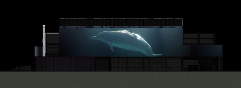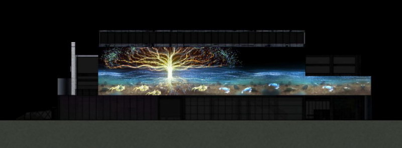 展示方式以立體投影為主,依托蠔鄉(xiāng)湖公園文創(chuàng)展館南側(cè)墻體,在墻體上以三維動畫+二維動畫+實景特效表現(xiàn)。
