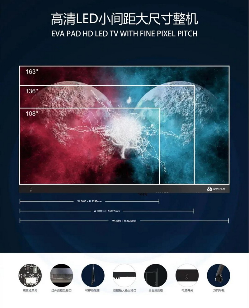 藍(lán)普視訊隆重推出 EVA PAD 高清LED小間距大尺寸一體機(jī),作為小間距大尺寸一體機(jī),由BSU63J的P1.2間距作為一體機(jī)的主體搭建,有著108英寸、136英寸、163英寸多種大尺寸可自由拼接,同時(shí)具備箱體本身28mm的超薄厚度,高對(duì)比度、3840Hz高刷新率、寬色域范圍帶給你更好的視覺體驗(yàn),同時(shí)多種功能、多種數(shù)據(jù)傳輸方式更適用于多種場(chǎng)景。