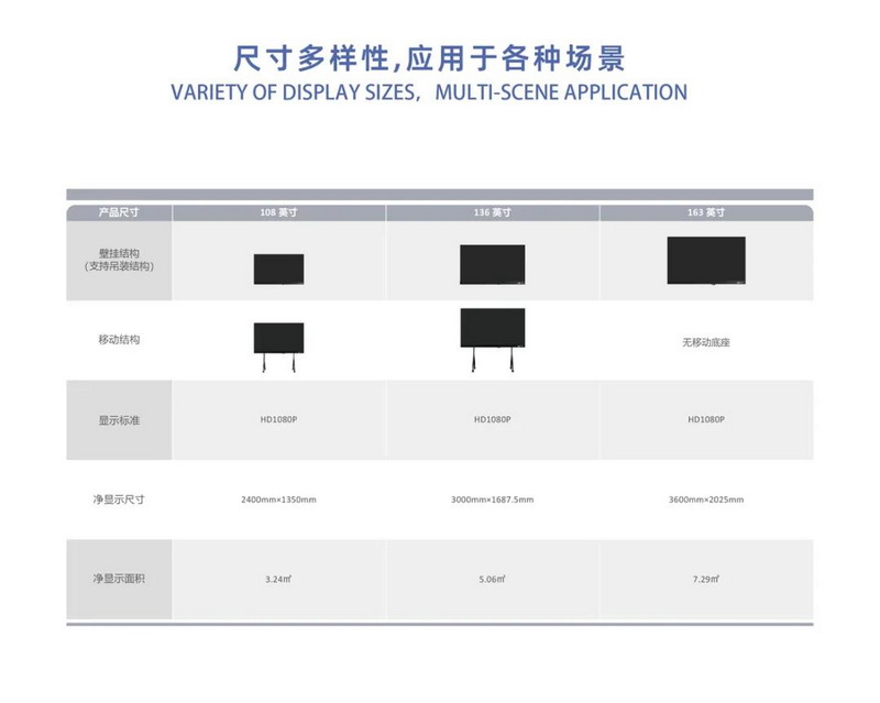 108“、136”、169“大尺寸,給你帶來(lái)沉浸式的視覺體驗(yàn),另外搭配堅(jiān)固的腳架方便移動(dòng),多種數(shù)據(jù)輸入輸出接口更加方便辦公。
