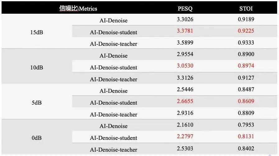 測(cè)試結(jié)果顯示,短時(shí)目標(biāo)清晰度(STOI)與語(yǔ)音質(zhì)量的感知評(píng)估(PESQ)均有所提升,并且隨著降噪量的提升,AI降噪效果的優(yōu)勢(shì)還能進(jìn)一步凸顯。