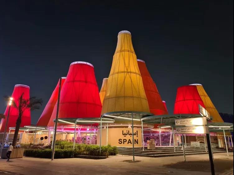 在"生命的智慧 "主題下,西班牙館位于可持續(xù)發(fā)展主題區(qū)。占地約5800平方米,由一系列圓錐體形狀的彩色裝置組成。這些圓錐體部分覆蓋有光伏板,以滿足展館的能的需求。