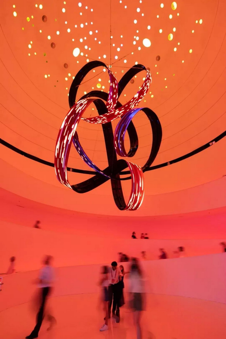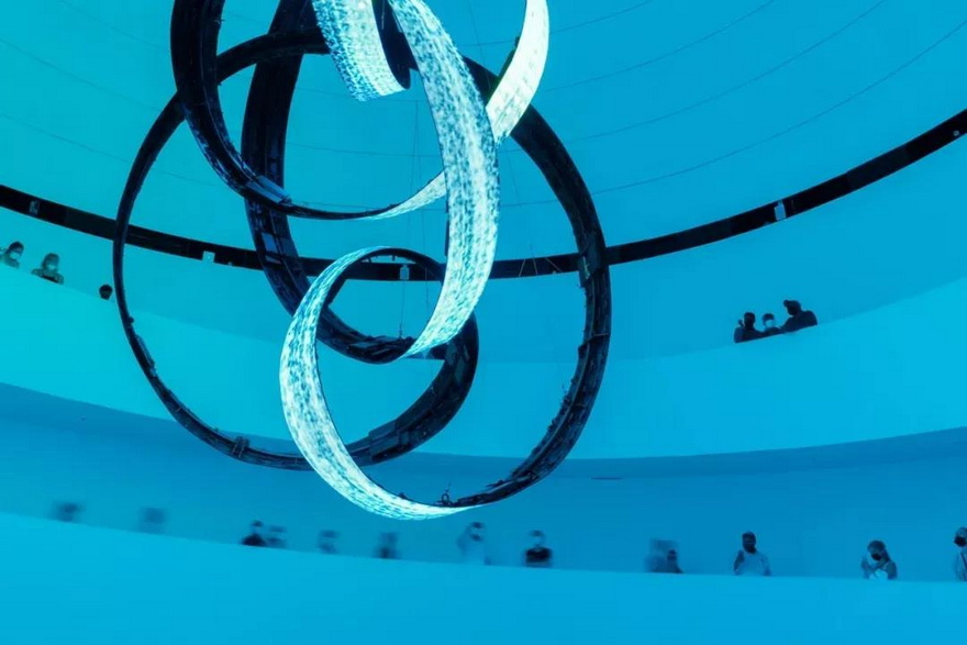 裝置被一條螺旋向下的階梯包圍,由三個LED屏幕組成,形狀像交錯的環(huán)形,通過游客和斜坡上欄桿的互動,產(chǎn)生視聽內(nèi)容。