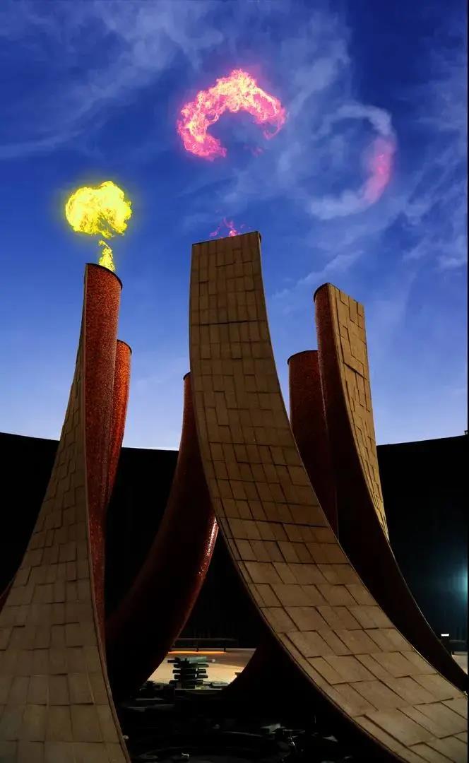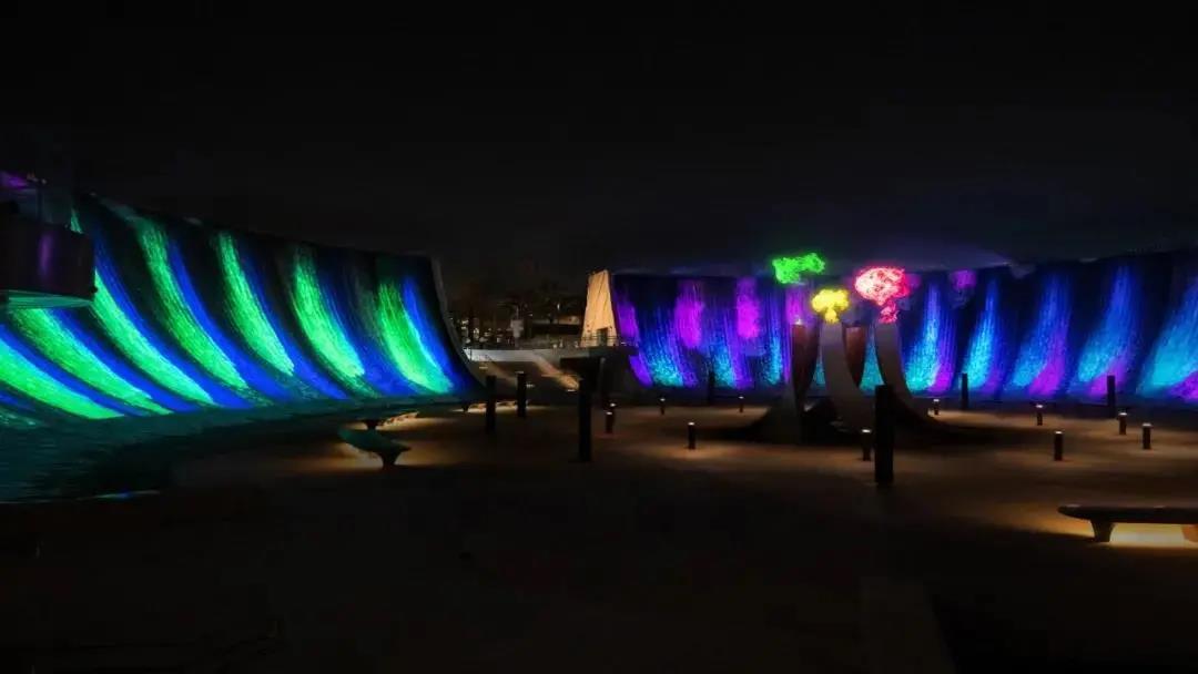 在迪拜世博上出現(xiàn)了一個(gè)水景觀裝置“Surreal(超現(xiàn)實(shí))”,它由 153 條水波組成,面積有半個(gè)足球場(chǎng)大。“Surreal”由美國(guó)洛杉磯水景設(shè)計(jì)公司W(wǎng)ET Design 創(chuàng)作完成,不同于常規(guī)的向上噴射的噴泉形式,而是模擬了瀑布從上而下流下的狀態(tài),另外,它會(huì)給人一種瀑布逆流的錯(cuò)覺,因?yàn)樗诳煲鞯降撞繒r(shí),又回調(diào)頭返回十幾米高的墻壁。在整個(gè)噴泉的中央,還有一個(gè)火焰噴射裝置,夜幕降臨,華燈初上,火焰和噴泉共同出現(xiàn),制造出一種水火共生的效果。
