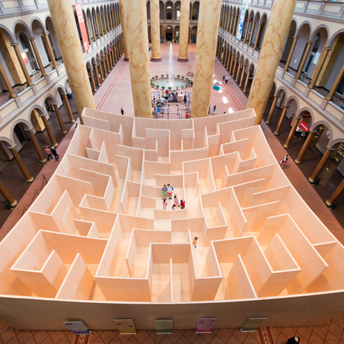 這個(gè)現(xiàn)代迷宮的靈感來(lái)自于古代迷宮、17和18世紀(jì)歐洲的花園和樹籬迷宮,以及現(xiàn)代美國(guó)的玉米迷宮。迷宮建造于博物館歷史悠久的大禮堂西側(cè)。除了從一樓觀看迷宮,游客還可以從博物館二樓和三樓的陽(yáng)臺(tái)上獲得意想不到的空中視角。