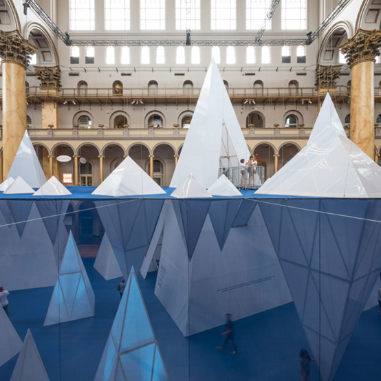 冰河由可重復(fù)使用的建筑材料建造,如腳手架、聚碳酸酯板等材料。6米高的"水位線 "可以從高處俯瞰海面,也可以將下面高聳的"貝格"之間的景色盡收眼底。最高的 "貝格 "為17米,可直接到達(dá)博物館的三層陽(yáng)臺(tái)。