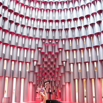 該裝置最高的圓頂高達(dá)18.29米,其特點(diǎn)是直徑超過(guò)3米的圓環(huán)。這些管子的特點(diǎn)是反射銀色的外部和鮮艷的洋紅色內(nèi)部,與博物館19世紀(jì)歷史悠久的內(nèi)部和巨大的科林斯柱形成鮮明的視覺對(duì)比。