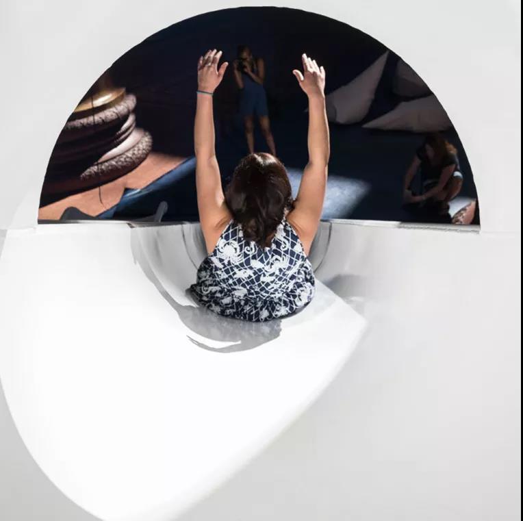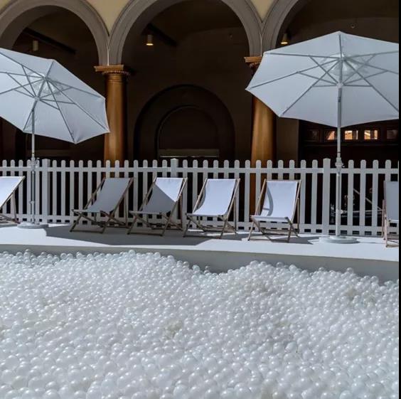 在博物館的西院,或者說(shuō) "前院",一個(gè)定制的再現(xiàn)《紀(jì)念鞠躬》(2012年),歡迎游客進(jìn)入空間。參觀者從房子里出來(lái)走向東庭,或 "后院",迎接他們的是《Playhouse》(2017年)和一個(gè)裝滿數(shù)十萬(wàn)個(gè)可回收塑料球的腎形泳池,讓人想起《The BEACH》(2015-17年)。