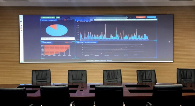 在某檢察院調(diào)度室,長虹工程激光電視通過智能融合呈現(xiàn)超寬幅畫面,約220吋的屏幕是整塊的菲涅爾光學(xué)屏幕,完全沒有拼縫,圖像尤其是可視化數(shù)據(jù)圖表的展示不會(huì)被切割。