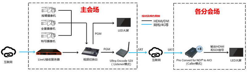 主會場部署的三臺影視高清攝像機拍攝的視頻信號連接到切換臺,切換臺制作后將2路PGM信號分別輸出給2臺美樂威Ultra Encode SDI編碼盒(1主1備),編碼器作為SRT Listener,可最高支持連接8個客戶端,然后通過主會場移動國家應急通信車提供的網絡進行互聯(lián)網傳輸;在其余8個會場,美樂威解碼器和LED大屏連接,解碼器作為SRT Caller,把解碼后的SRT流輸出給大屏顯示供與會代表觀看。活動期間,各分會場可清晰看到主會場輸出的PGM信號,畫面流程清晰,現(xiàn)場感知良好,整場活動受到了省市區(qū)(縣)政府及參會單位的一致好評。