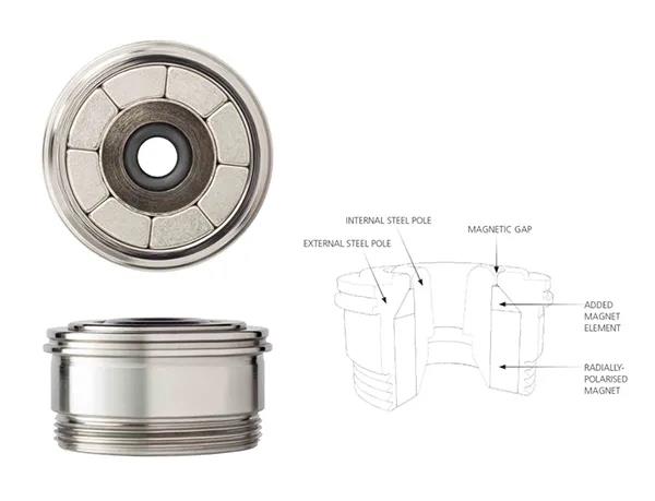 單元后方也有學(xué)問(wèn)。他們的磁鐵稱(chēng)為Super Flux Magnet,Vivid高音單元的磁鐵必須配合導(dǎo)管形狀,不能太大,這樣也才能更拉近和中音單元的距離。因此他們的磁鐵磁力特強(qiáng),高達(dá)2.5特斯拉。高磁力的磁鐵,有助于提高Vivid音箱的單元效率,例如G1上所使用的高音單元,效率就高達(dá)97dB,更利于再生細(xì)節(jié)。音圈繞線采包銅鋁線,取其質(zhì)量輕的特點(diǎn)。而音圈與磁鐵間的距離,也就是所謂的磁隙越小越好,這樣才有更高的磁通量帶動(dòng)音圈。可是,當(dāng)音圈運(yùn)動(dòng)時(shí),會(huì)擠壓到磁隙內(nèi)那極少的空氣,這會(huì)阻礙音圈的運(yùn)動(dòng)。Vivid的解法是在音圈套筒上挖出孔洞,這稱(chēng)為Highly Vented Former (HVF) 。
