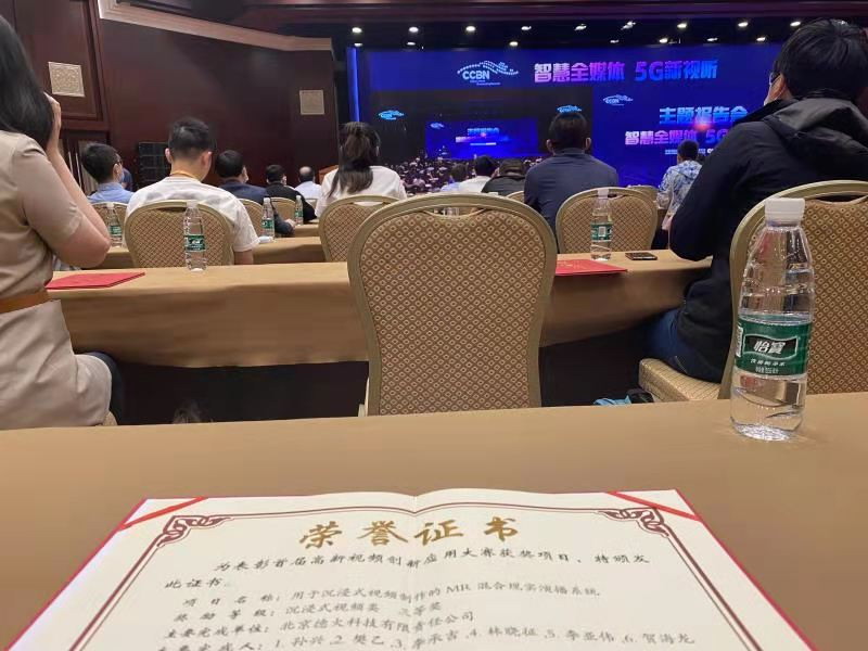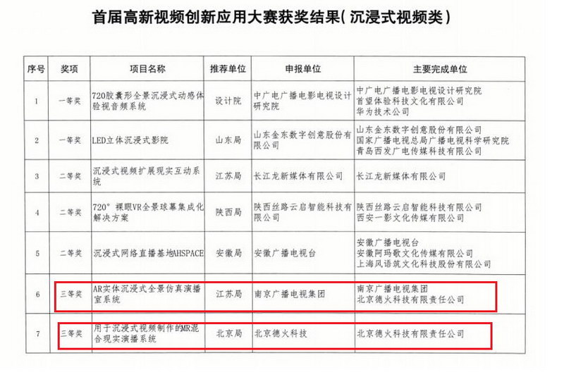 當(dāng)日主題報告會上,首屆高新視頻創(chuàng)新應(yīng)用大賽頒獎儀式在北京國際會議中心隆重舉行。經(jīng)過專家組委會層層篩選,千家企業(yè)強強角逐,北京德火科技、南京廣播電臺&北京德火科技通過5G應(yīng)用、技術(shù)演示、效果呈現(xiàn)等多方面優(yōu)異表現(xiàn),經(jīng)過多番評審,最終憑借《沉浸式視頻制作的MR混合現(xiàn)實演播系統(tǒng)》、《AR實體沉浸式全景仿真演播室系統(tǒng)》獲得沉浸式視頻類三等獎。