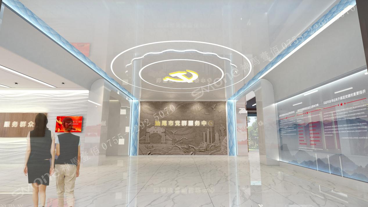 服務(wù)中心頂部黨徽造型,天花板黨徽燈帶環(huán)繞,象征黨的光輝照耀、 指引汕尾的建設(shè)發(fā)展,整個(gè)大廳給人以大氣、莊重的印象,又具獨(dú)特汕尾特色。