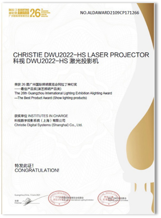 上海(2021年7月6日):科視Christie® 自豪地宣布其DWU2022-HS 1DLP® 激光投影機在2021 年阿拉丁神燈獎中贏得最佳演藝照明產(chǎn)品獎。科視DWU2022-HS 是專為中國市場而開發(fā)的HS 系列型號。