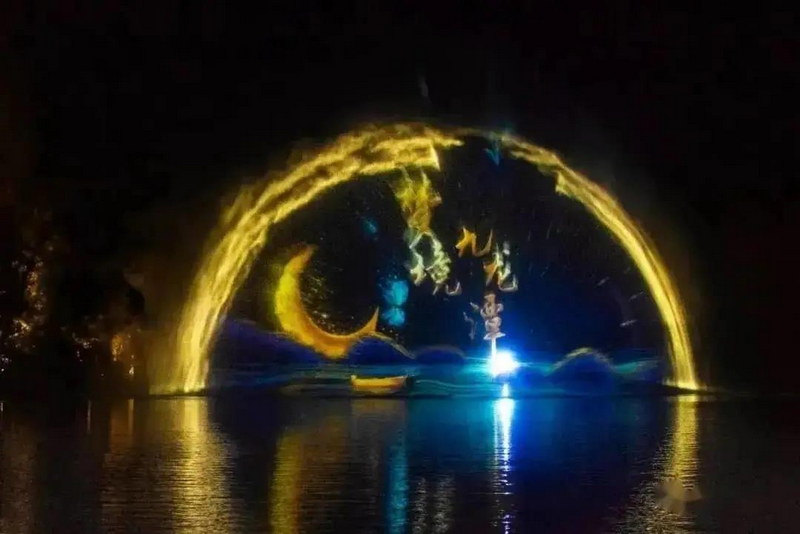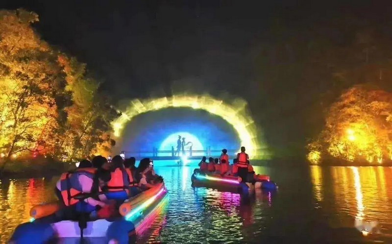 采用最新5D、全息投影、互動(dòng)新媒體、裝置藝術(shù)、燈光秀等技術(shù)與九龍?zhí)短赜械乃系は嫉孛病r石、洞穴相結(jié)合,建設(shè)成為全國首個(gè)水上丹霞行浸式山水夜游項(xiàng)目。