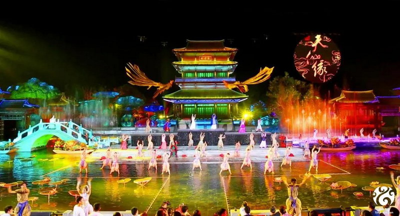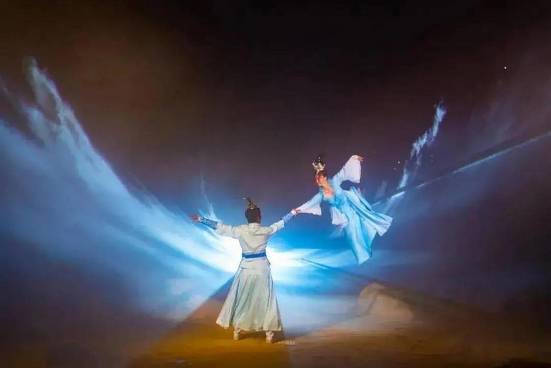 《天仙緣》實(shí)景劇通過燈光、場景和人物的變化,營造出不同的意境美,其中,最令人嘆為觀止的是仙女下凡場景。七位仙氣飄飄的美人采用360°無痕跡“飛翔”技術(shù)從天而降。這不僅要體現(xiàn)出演員的高超演技,更體現(xiàn)對高科技、聲光電、水效果、空中威亞等綜合式的審美。