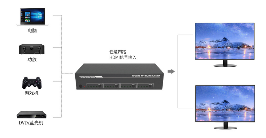 冠藝HDMI 2.0 四進(jìn)四出矩陣兼容所有的顯示設(shè)備,輕輕松松的復(fù)制顯示設(shè)備的數(shù)據(jù),像投影儀,電視機(jī),顯示屏,拼接屏,監(jiān)視器等都可以連接在HDMI矩陣4進(jìn)4出的4個(gè)輸出端口上,進(jìn)行視頻圖像信號(hào)傳輸。